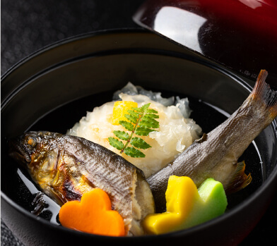 日本庭園を備えた、落ち着いた佇まいの店内で、地元東栄町産の若鶏や、利き鮎コンテスト日本一になった振草川の鮎料理(夏季のみ)など、東栄町でしか味わうことのできない山の幸から、毎朝市場にて直接仕入れを行う新鮮な魚介類など、豊富なメニューをお楽しみいただけます。